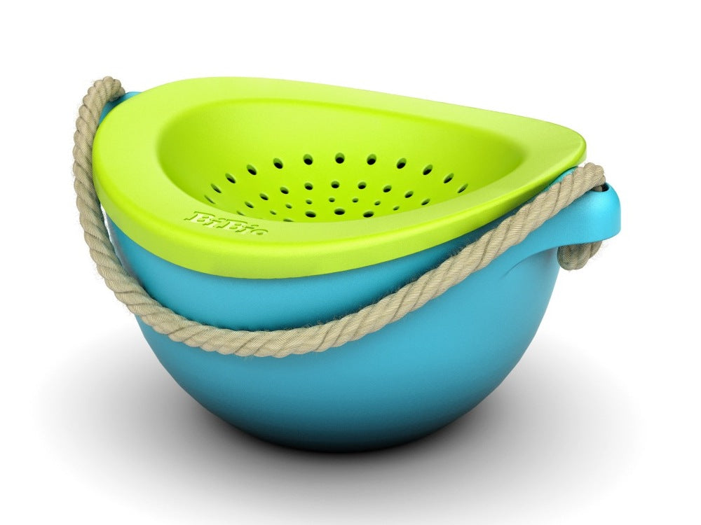 Cubo con forma de caparazón y asa de cuerda que incluye una tapa tipo tamiz.