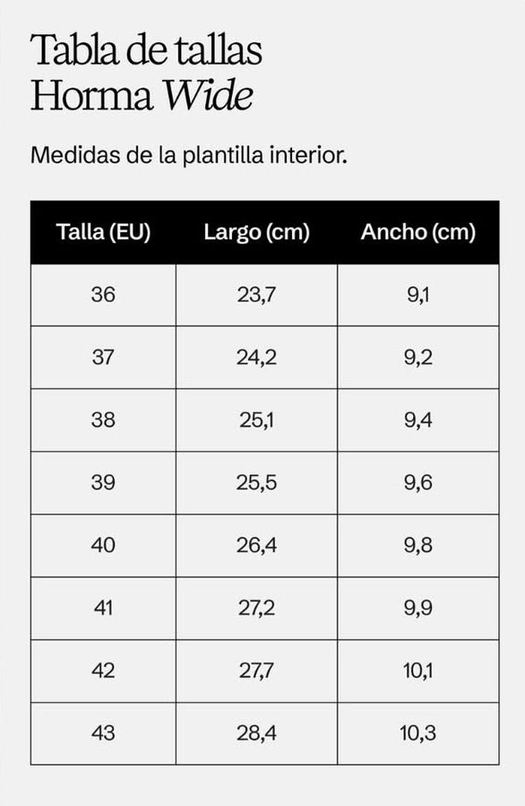 Diseñada para pies más anchos.