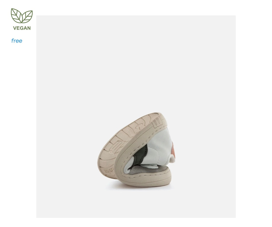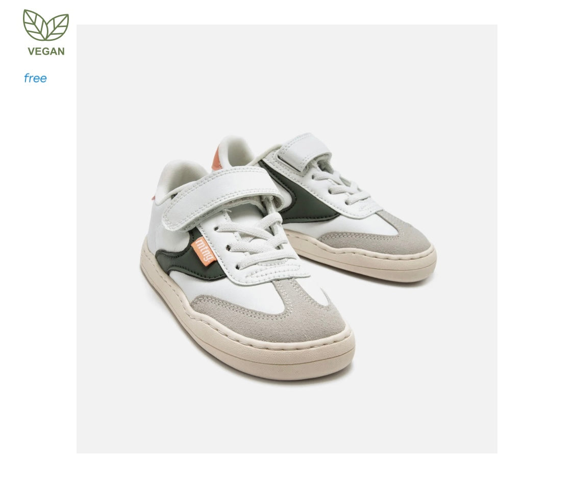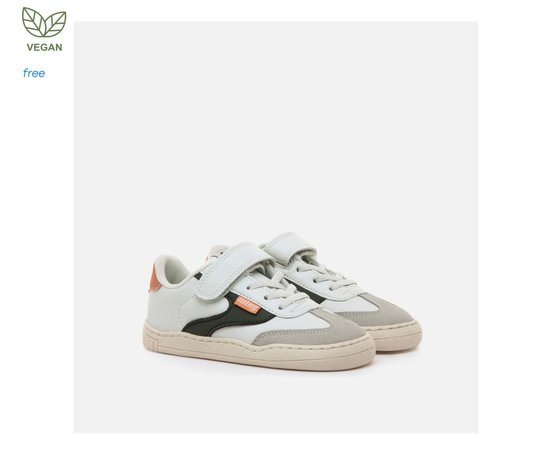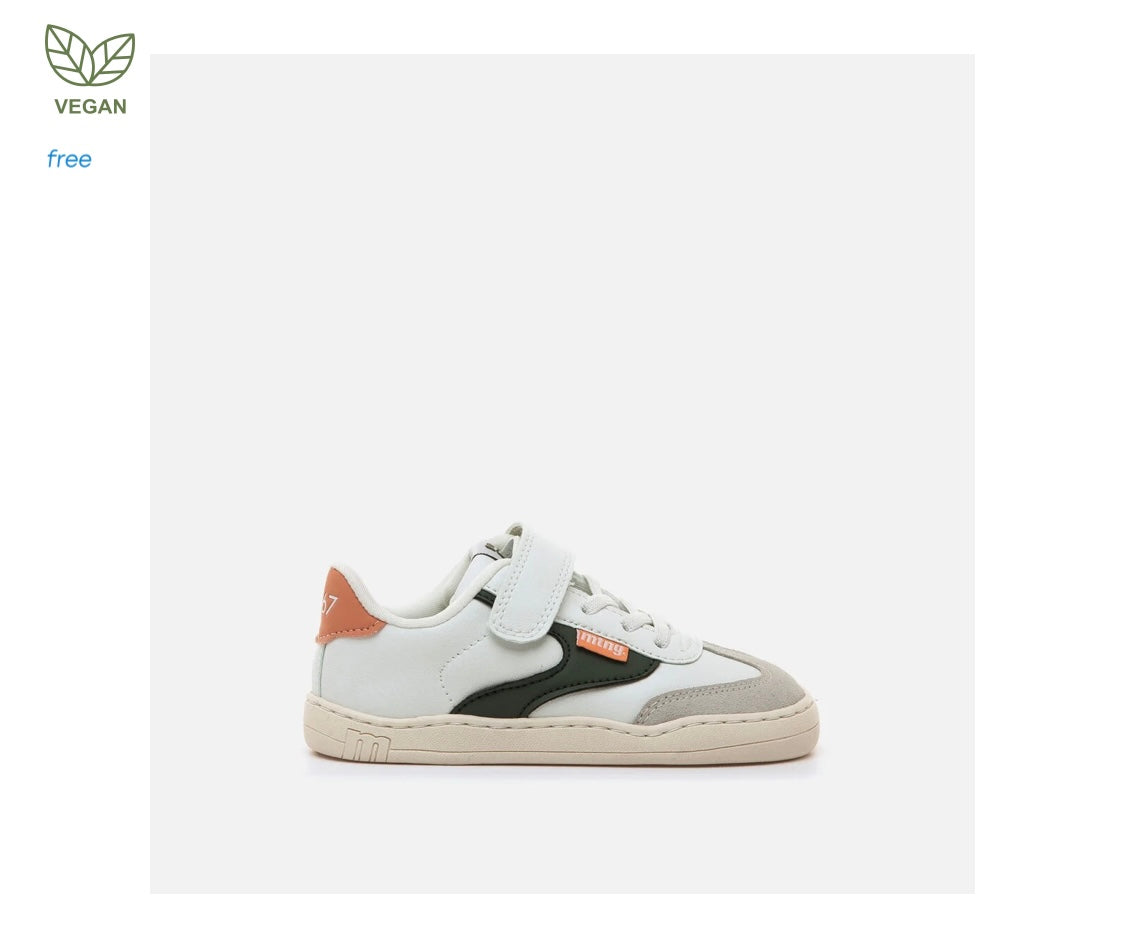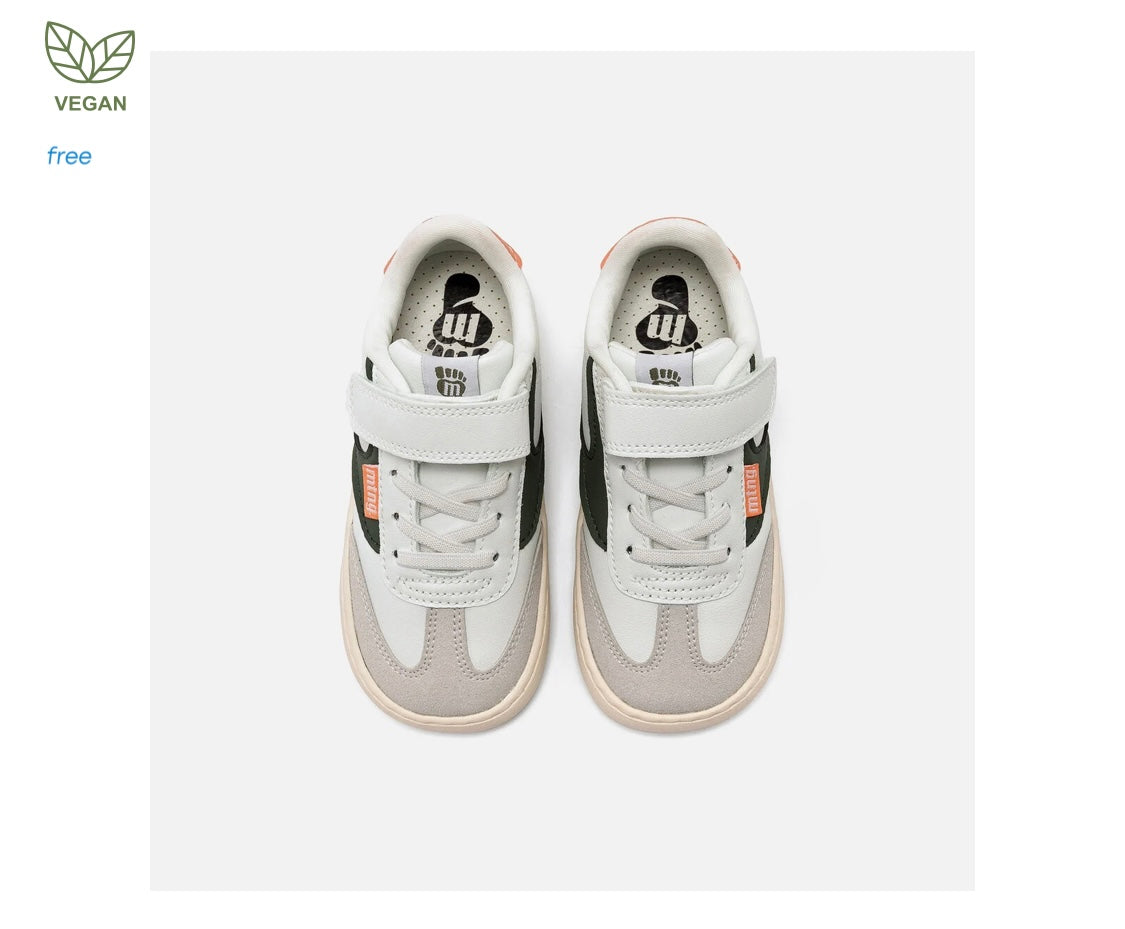 Zapatillas barefoot tipo deportivas para niños de la marca Mustang, modelo Free de color blanco. Incorpora detalles de color verde kaki y gris claro, además de una pieza trasera en tono salmón. El cierre combina cordones elásticos y tira adherente para un ajuste práctico y rápido. Diseñado y desarrollado especialmente en colaboración con el Dr. Juanjo López, traumatólogo deportivo e infantil, para respetar el desarrollo natural del pie del niño y la niña. Gracias a su puntera ancha permite el libre movimiento de los dedos dentro del zapato. Las plantillas extraíbles facilitan comprobar si la talla del calzado es la correcta para tu hijo. Además, su fácil apertura facilita que el niño pueda descalzarse y calzarse de forma autónoma. Con certificado VEGANO sellado por INESCOP, el cual garantiza que la naturaleza química principal del material no se corresponde con fibras de origen animal.