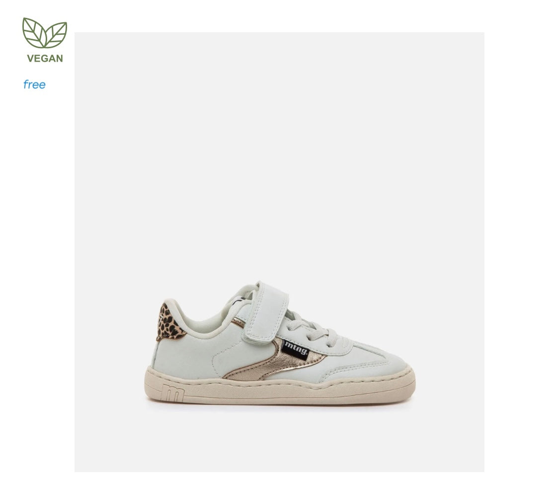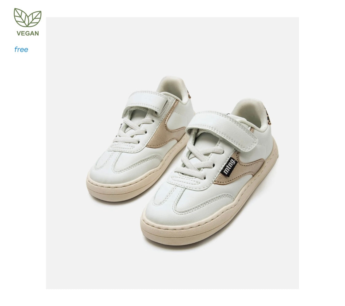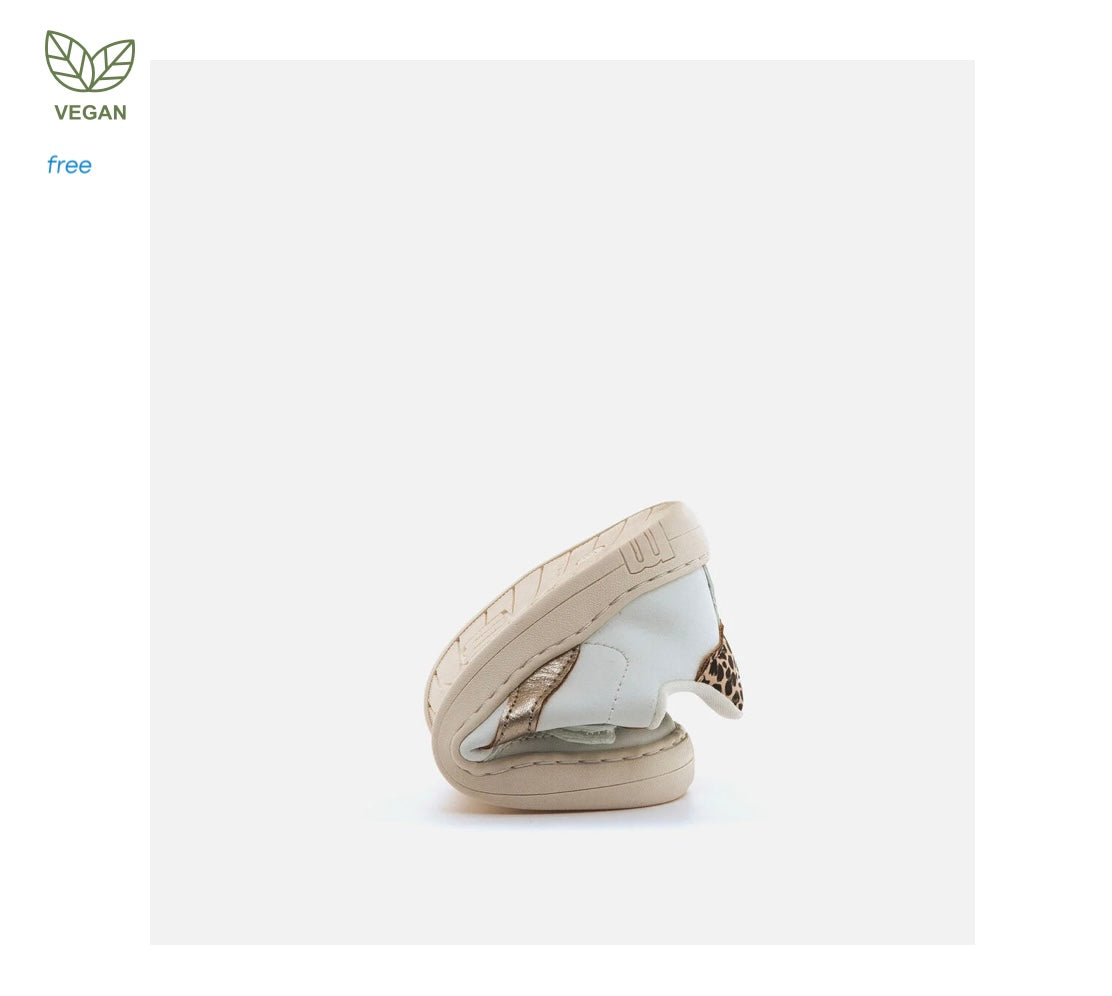 Zapatillas barefoot lavables de color blanco para niña, modelo Free de la marca Mustang, estilo urbano. Incorpora detalles metalizados dorados y talón con estampado animal print de leopardo que aportan un toque distintivo al diseño. El cierre adhesivo y los cordones garantizan un ajuste cómodo y práctico. Diseñado y desarrollado especialmente en colaboración con el Dr. Juanjo López, traumatólogo deportivo e infantil, para respetar el desarrollo natural del pie del niño y la niña. Gracias a su puntera ancha permite el libre movimiento de los dedos dentro del zapato. Las plantillas extraíbles facilitan comprobar si la talla del calzado es la correcta para tu hijo. Además, su fácil apertura facilita que el niño pueda descalzarse y calzarse de forma autónoma. Con certificado VEGANO sellado por INESCOP, el cual garantiza que la naturaleza química principal del material no se corresponde con fibras de origen animal.
