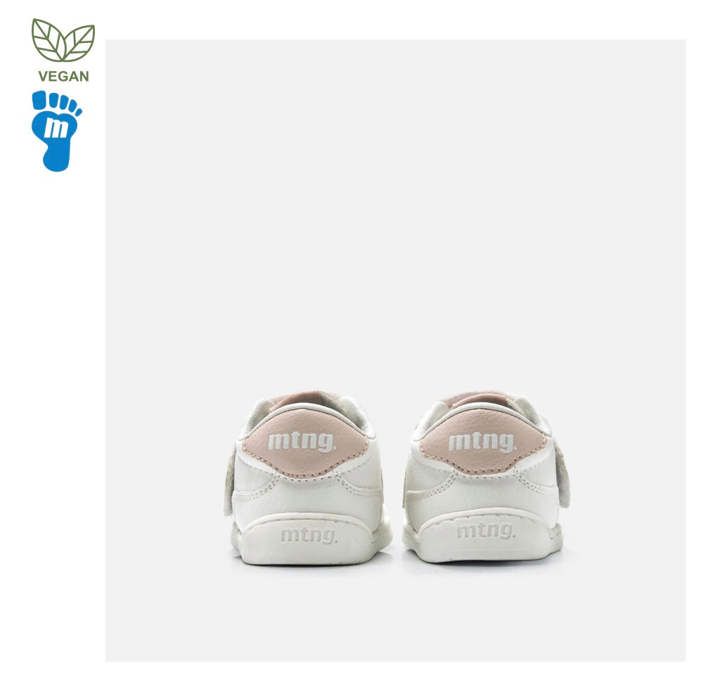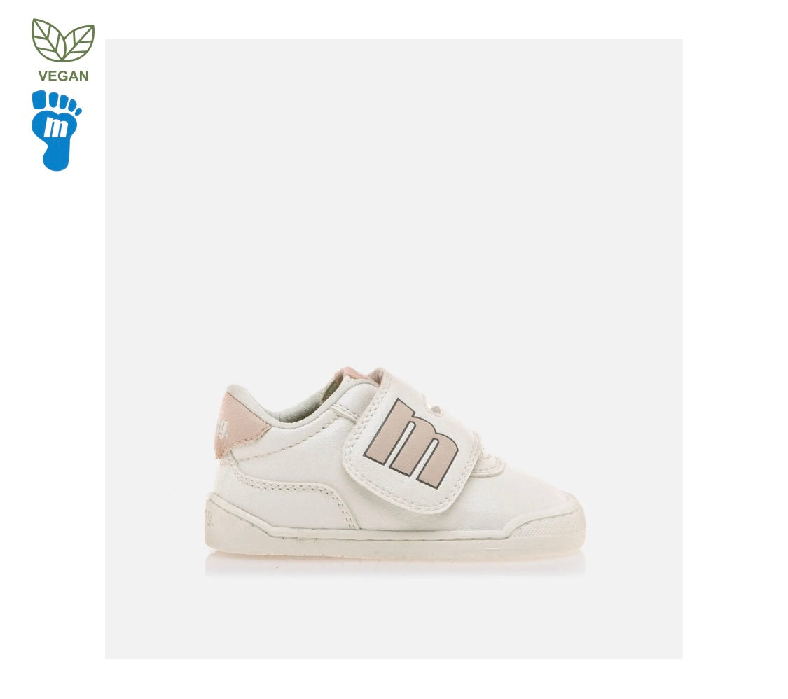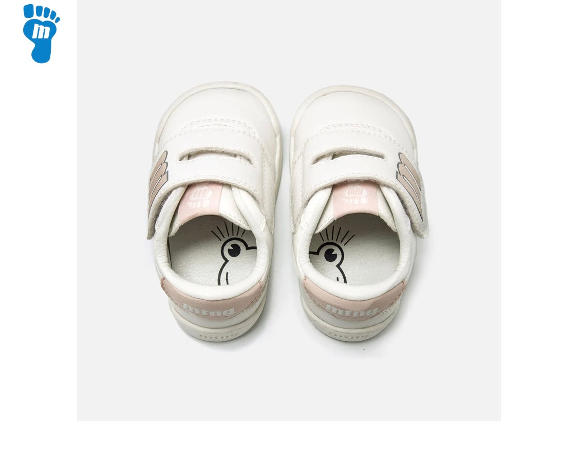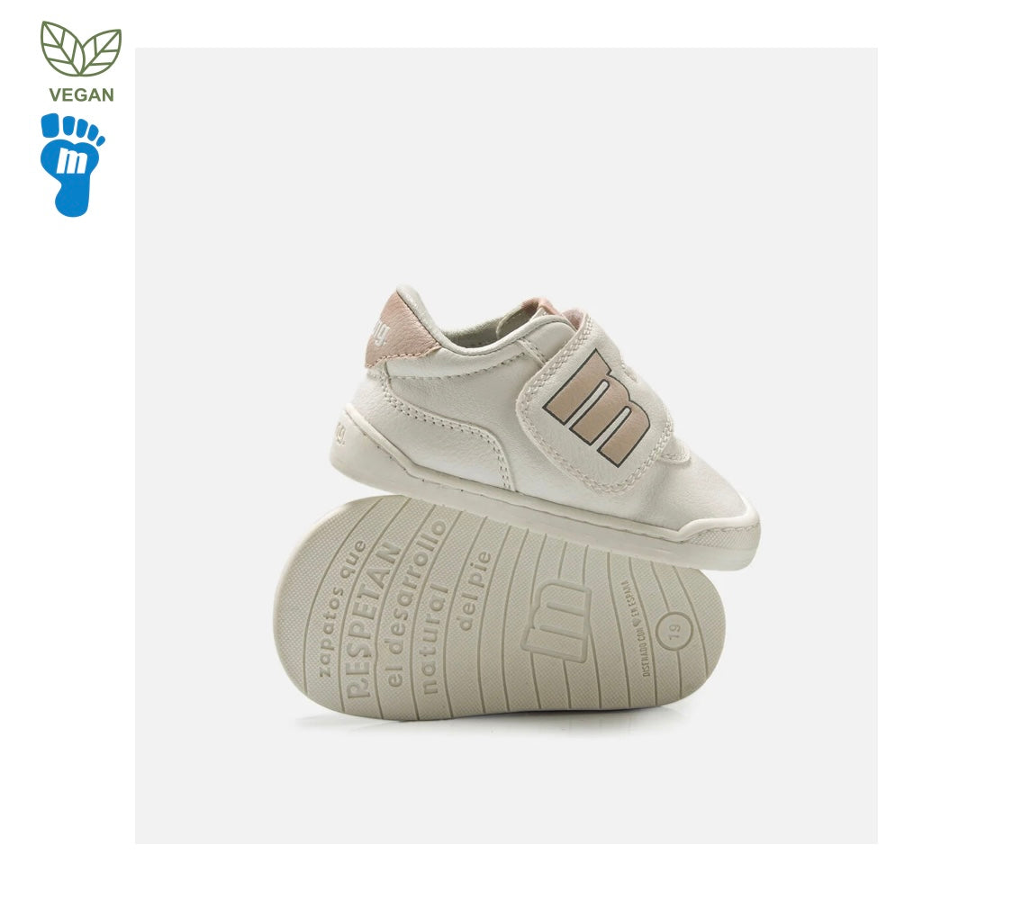 Zapatilla deportiva Free Mustang para bebé, diseñada en color blanco roto, incluye el logo de la marca bordado de color rosa nude en el lateral. Cierre de tira adhesiva para una puesta más cómoda. Diseñada y desarrollada especialmente en colaboración con el Dr. Juanjo López, traumatólogo deportivo e infantil, para respetar el desarrollo natural del pie del niño y la niña. Gracias a su puntera ancha permite el libre movimiento de los dedos dentro del zapato. Su suela tiene 3 mm de grosor y con zero drop (totalmente plana) respeta el natural desarrollo del pie del pequeño y sus elementos flexibles y torsionables hace que el pie del niño no esté encorsetado por la estructura del zapato. Las plantillas extraíbles y las marcas de los dedos en la misma, facilita comprobar si la talla del calzado es la correcta para tu hijo. Además, su fácil apertura facilita que el niño pueda descalzarse y calzarse de forma autónoma. Con certificado VEGANO sellado por INESCOP, el cual garantiza que la naturaleza química principal del material no se corresponde con fibras de origen animal