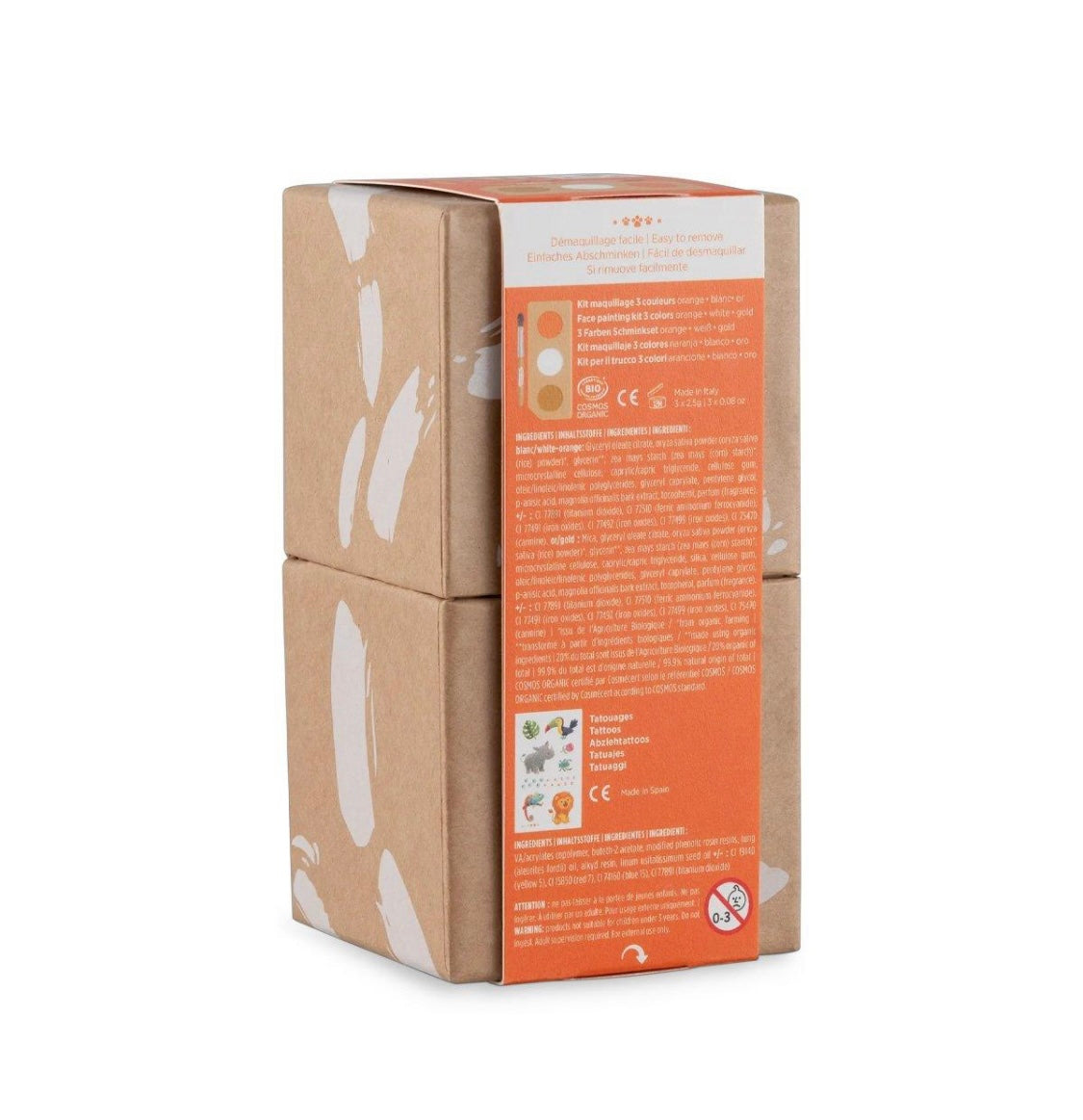 - Paleta de pintura facial de 3 colores: naranja, blanco, dorado.